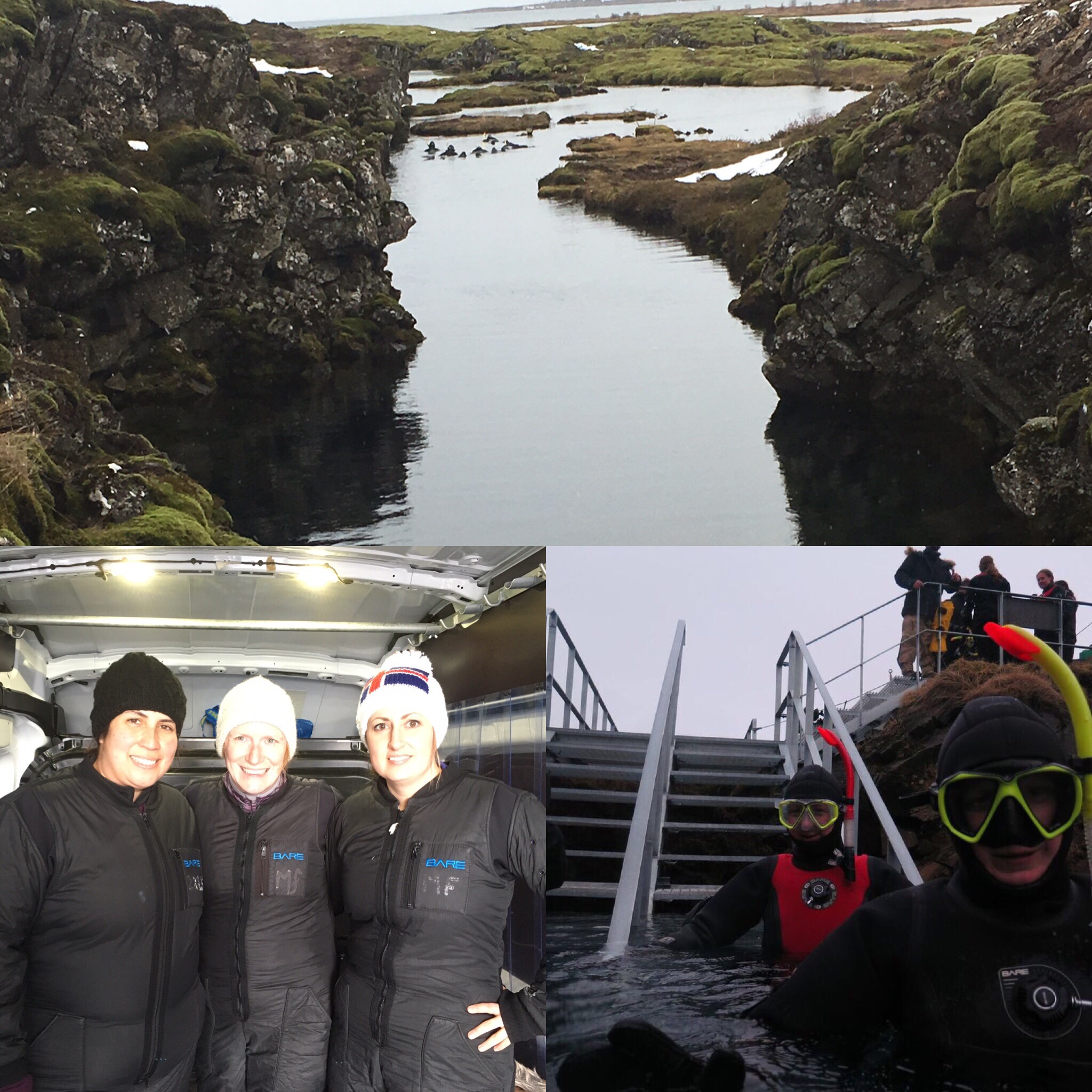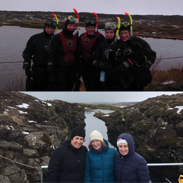 We arrived at Pingvellir National Park full of nerves and excitement. We were a group of 5 – us 3 and 2 ladies from Belgium. Our guide Richard P was wonderful we felt safe and ready for what he described would be an amazing experience. It was quite the production getting ready. On top of our own thermals and wool socks there was a thermal onesie – like Thomas’s snowsuit and then a dry suit. The dry suit was a challenge because it was very tight around the neck, thankfully I was the only one in our group that didn’t need what I can only describe as a rubber dog collar.