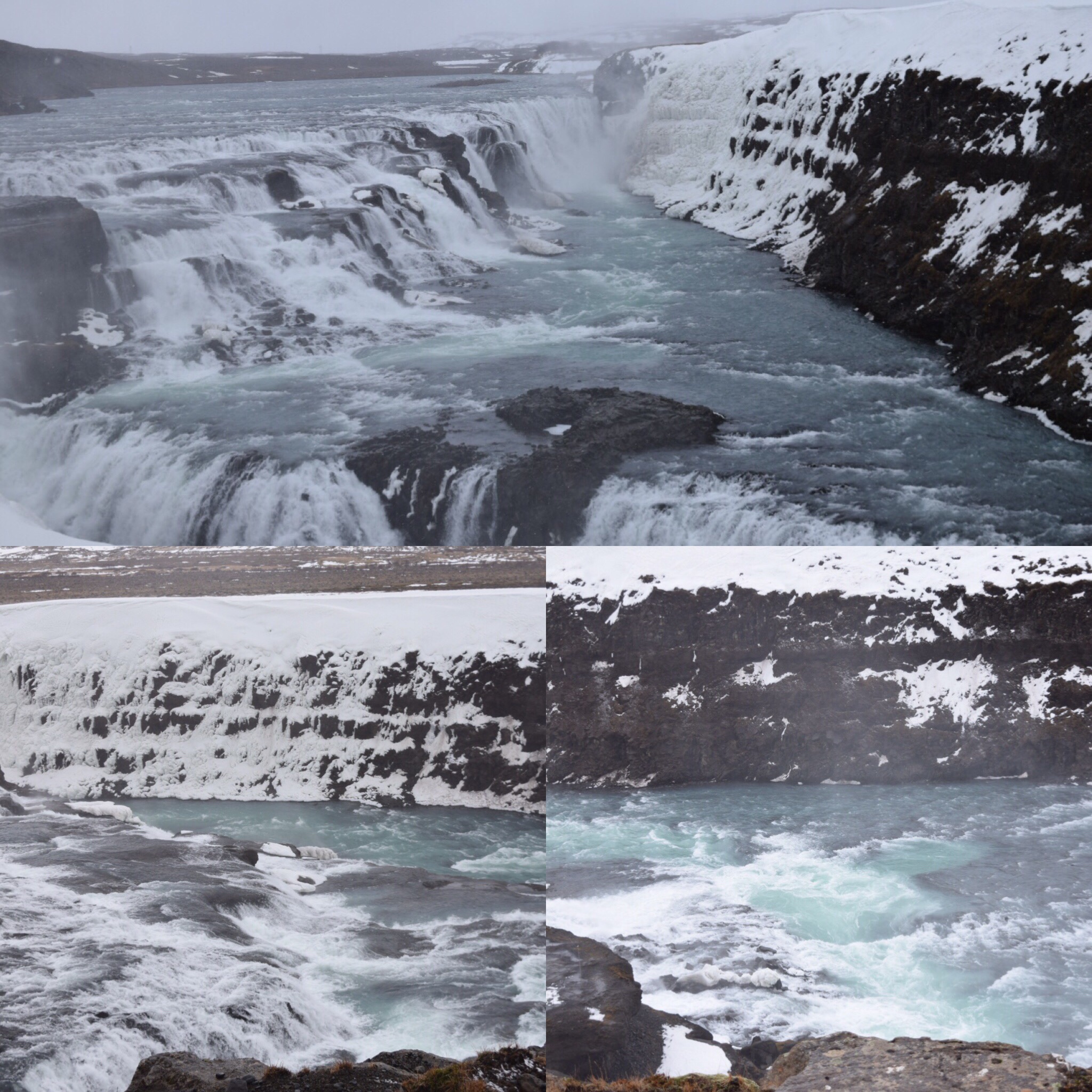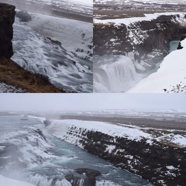 Now to Gullfoss. Gullfoss is absolutely incredible and it’s popularity as a tourist attraction is quite understandable. It is actually two separate waterfalls, the upper one has a drop of 11 metres and the lower one 21 metres. The rock of the river bed was formed during an interglacial period. It leaves one in awe. I loved watching the water and seeing the ice hang from the rocks. Some of the water and ice are blue. It really is beautiful. I took a ton of pictures, but it is best witnessed in real life. This is a must do.