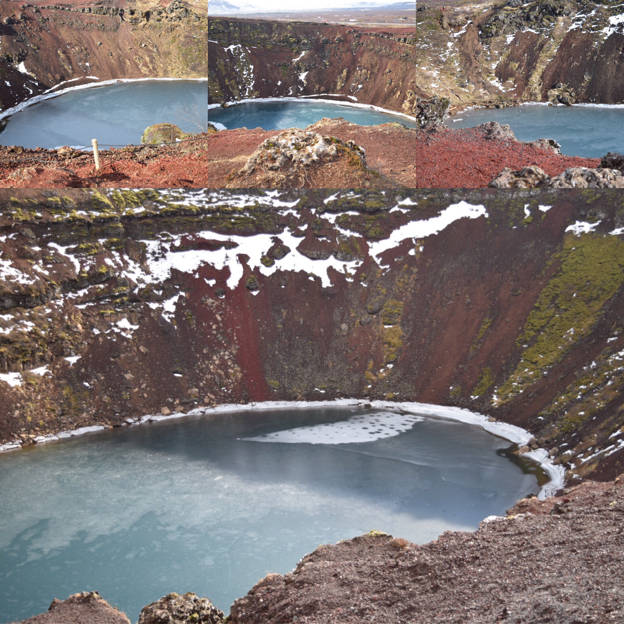 Our next stop before lunch is Kerid – a volcanic crater lake. This is extraordinary! The red volcanic rock, frozen and green moss. We walked all around the top of Kerid and tried to capture its beauty in some pictures.