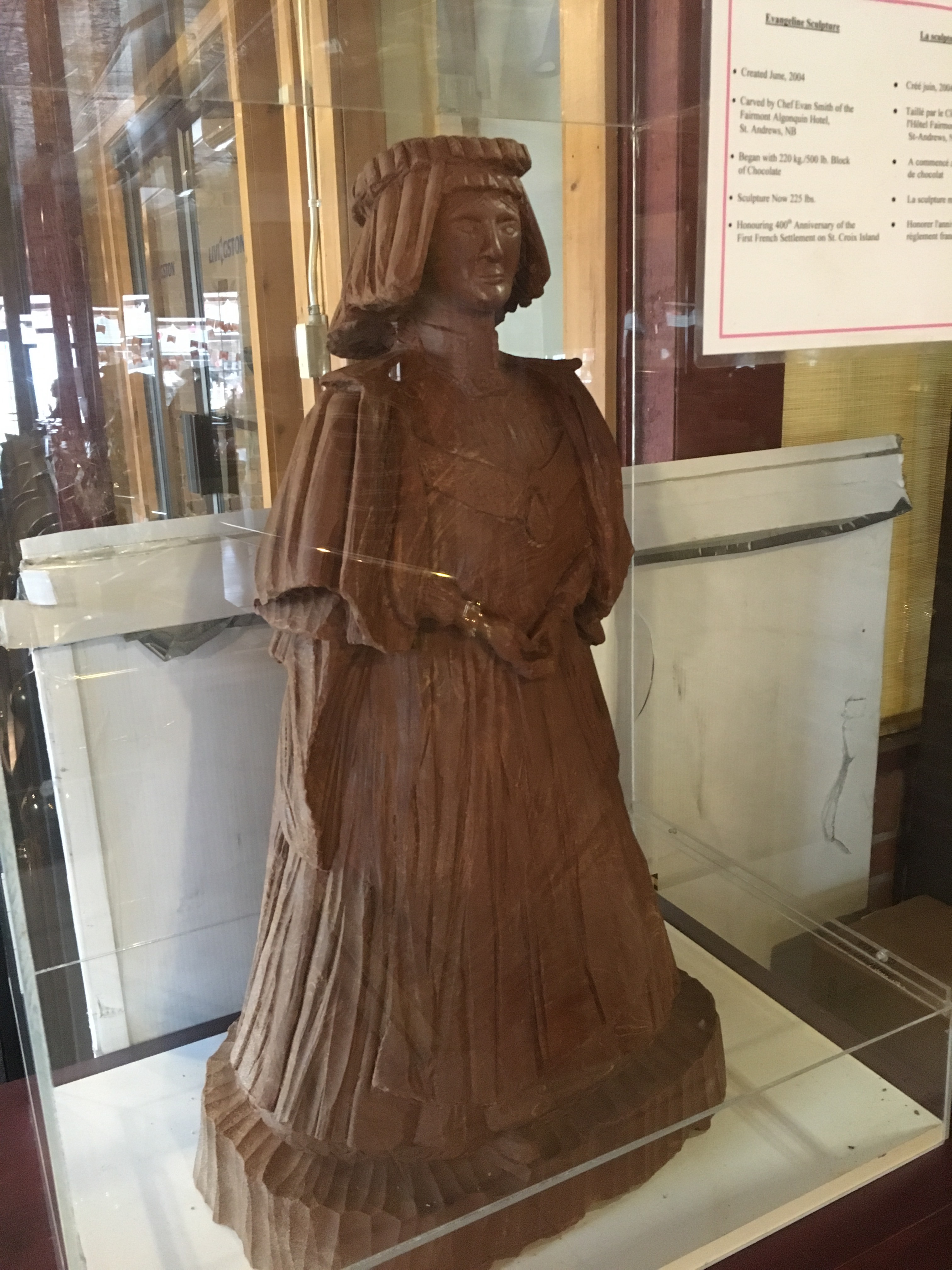 It is a short drive to St. Stephen, Canada’s Chocolate Town. The Gagnong chocolate factory is here. We had some samples and bought a few chocolates to go. My favourite where the fruitful au chocolate, the fruitjelly candy covered in dark chocolate, the strawberry and peach were delicious treats. In the store there is a chocolate sculpture of Evangeline to honour the 400th anniversary of French settlement on St. Crook Island. It was created in June 2004 by a chef at the Fairmont Algonquin Hotel in St. Andrews. The impressive sculpture began with a 500 pound block of chocolate and now weighs 225 pounds.
