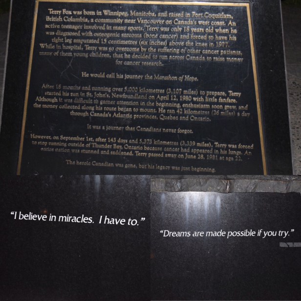 Behind Mile 0 monument is the Terry Fox statue. Terry Fox, a true Canadian hero, started the Marathon of Hope in Newfoundland and had planned on finishing at the Mile O monument in Victoria. Terry died before finishing his marathon however he is an inspiration to all. He brought more awareness about cancer and the importance of cancer research. According to the Terry Fox foundation to date $680 million has been raised world wide in Terry Fox’s name for cancer research. Terry Fox’s legacy continues.