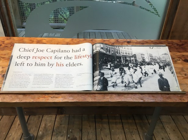 Time to take the city bus to Capilano Suspension Bridge Park. As you enter the park there is information about local First Nations Peoples and Chief Joe Capilano. Chief Joe Capilano became Chief of the Squamish in the late 19th century. He travelled to Vancouver Island and the coat to talk to other First Nations to talk about the important of Native rights. He led a delegation to London to meet King Edward VII in 1906 to discuss issues and rights.